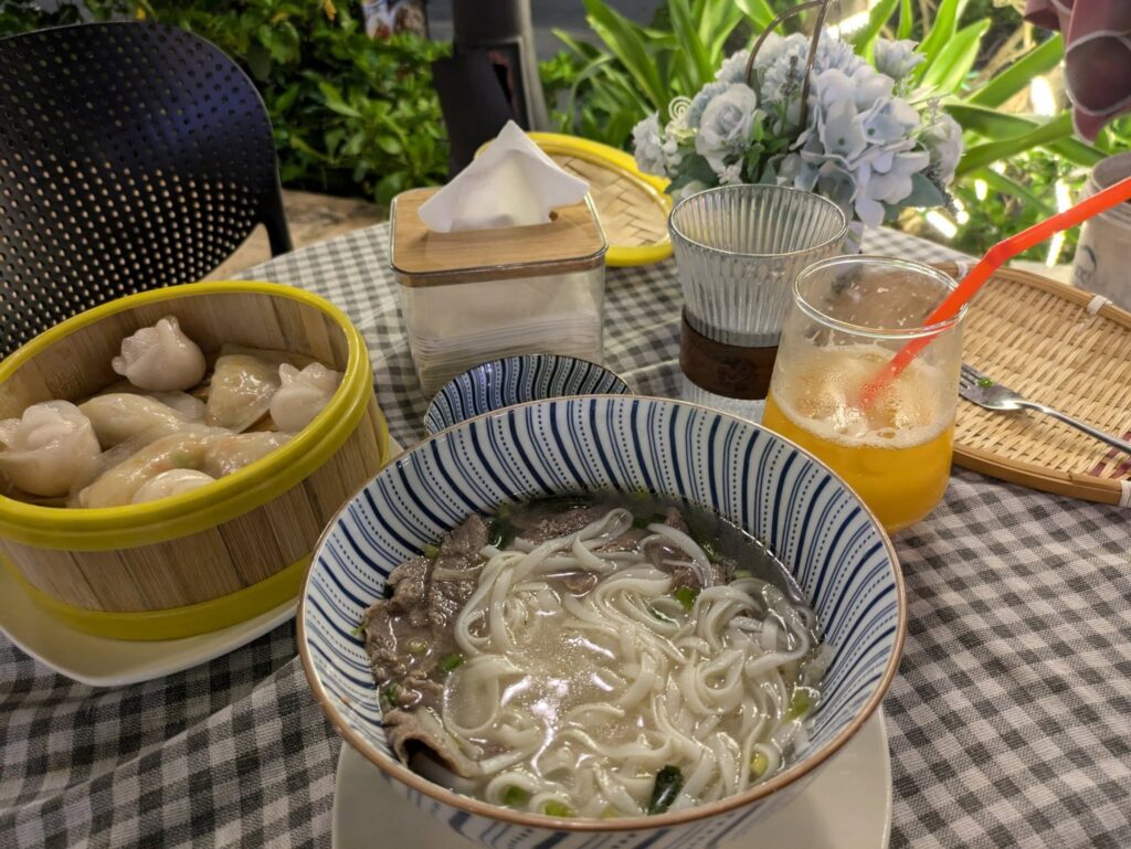 夜は控えめ?にフォーとバイン・ボッ・ロック(ベトナムのエビ入り水餃子?)を食べました。