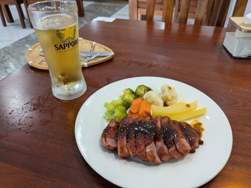 マッシュルームハンバーガーと鴨スモークとマンゴージュースとビールを注文しました。(下画像)