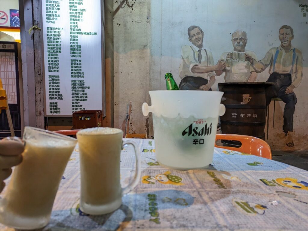ビールのウォールアートの前でイポー名物のアイスビールと一緒に写真撮るのが特におすすめです!(写真左)