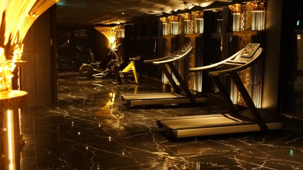 フィットネスセンターは最新マシンが揃い、夜にはゴージャスな感じにライトアップされます。