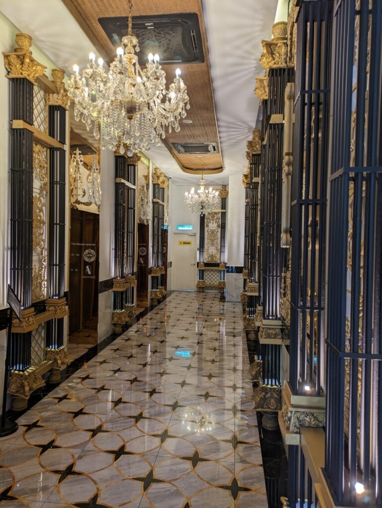 巨大なシャンデリアと壁面アートが圧倒的な存在感を放ちます。