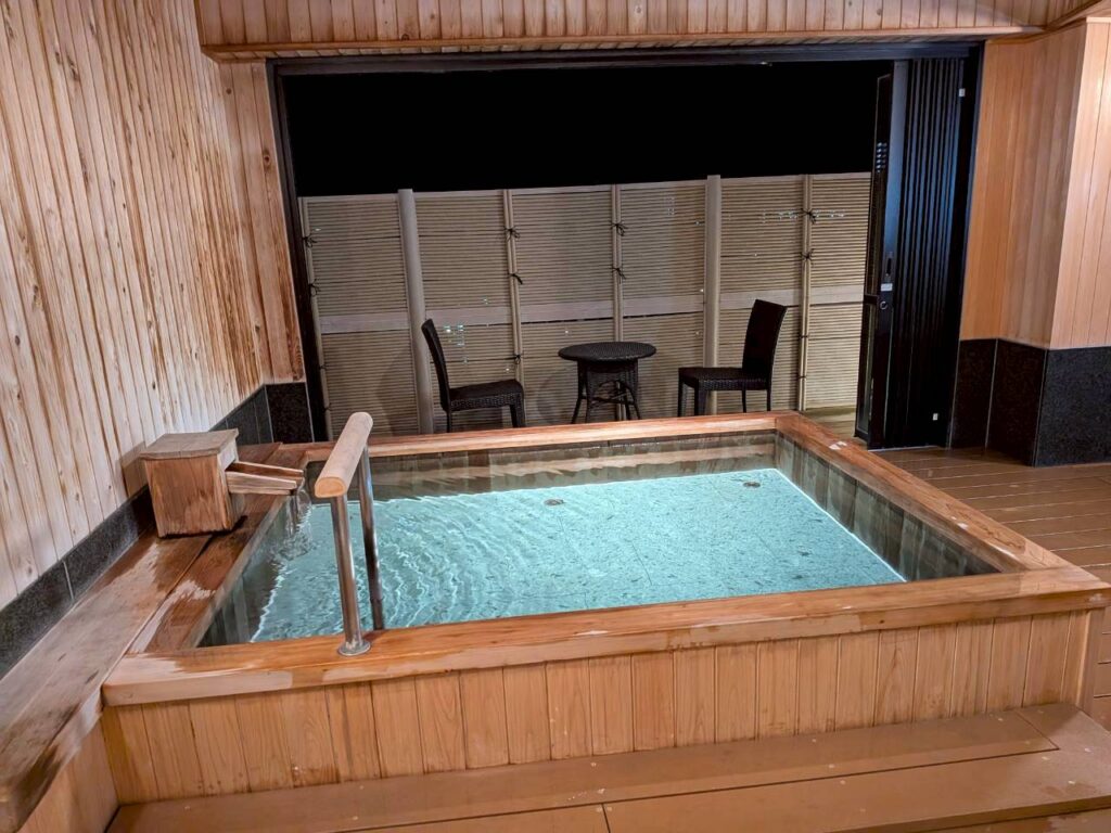 館内の源泉かけ流しの貸切露天風呂を利用し、夜風を感じながらの湯浴みを満喫しました。