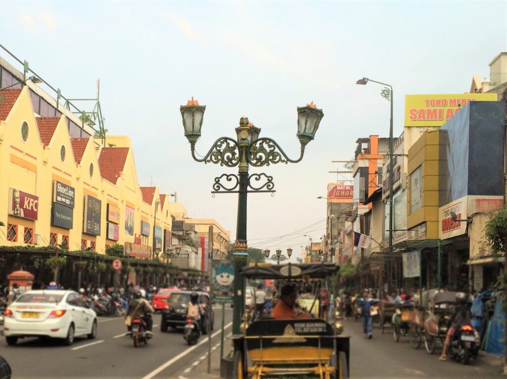 ジョグジャカルタの中心地、**マリオボロ通り**は、昼も夜も活気に満ちたショッピングストリート。